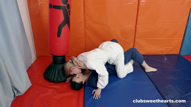In "Karate match with Elloise Arti and Katy Zachry" our sweethearts begin with a playful karate match, throwing kicks and trying to pin each other down. They laugh, tumble, and roll around until the fight turns into soft touches and hot kisses. Clothes come off, tits bounce free, and the blonde and brunette can’t resist going further. What started as a game ends with wet tongues, hungry hands, and two fighters cumming hard together.