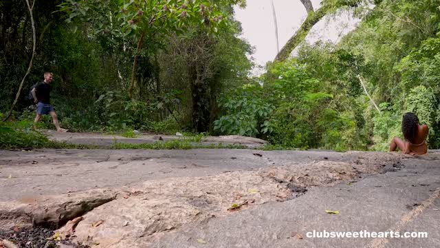 Mesmerizing blue-eyed ebony Jasminy Villar, wearing nothing but a playful smile, heats up the outdoors in this steamy interracial scene. The cute, easy-going 18+ teen teases Alias White with a sensual blowjob and wet handjob under the sun. He licks her moist pussy until she moans, then bends her over for some hot doggystyle pounding. The chemistry becomes unbearable ending with a big cumshot finish.